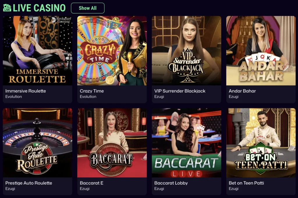 | Total Games | 8,000+ titles including: Slots, RNG Tables, Live Tables, Speciality Options |